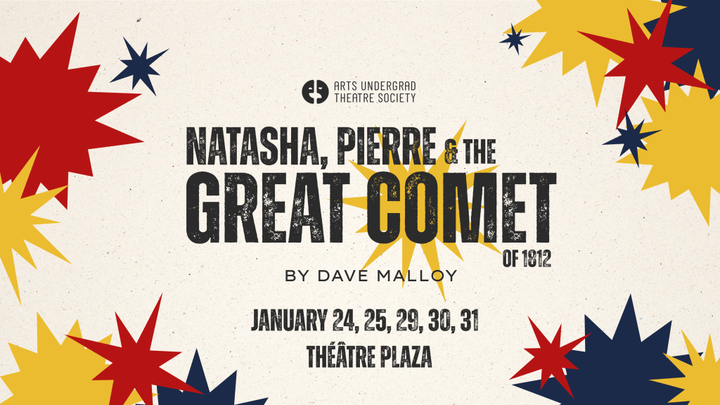 Welcome to the opera! Experience Natasha, Pierre & the Great Comet of 1812 by Dave Malloy, presented by the Arts Undergraduate Theatre Society. This 12-time Tony-nominated show is packed with laughs, love, and incredible music – you won’t want to miss it.